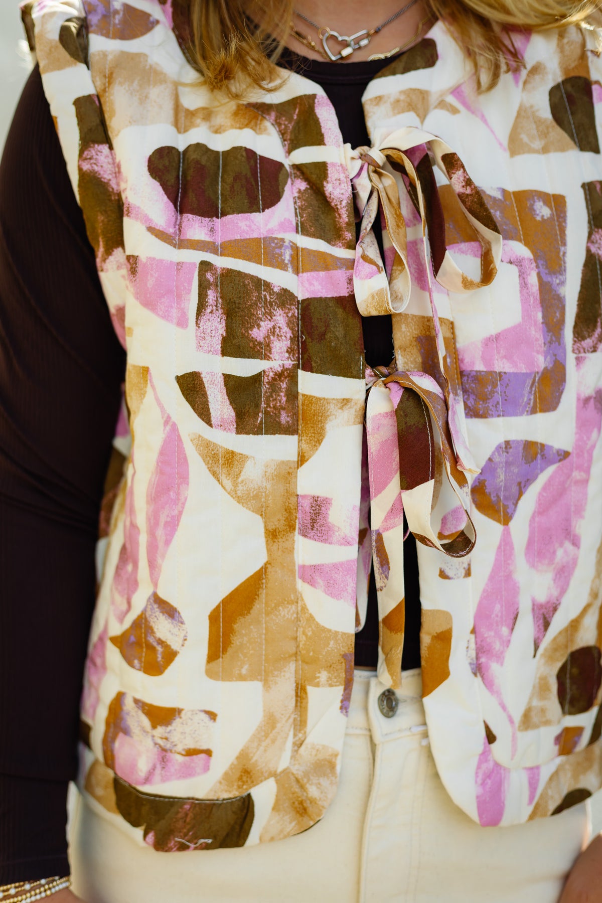 Elevate your style this season with The Effie Vest, crafted from ultra-soft quilted cotton in an exclusive abstract print. Its slightly boxy, sleeveless design features elegant quilted embroidery, practical pockets, and a unique double bow tie closure that adds a charming, feminine touch. Lightweight and lined for comfort, this vest effortlessly enhances any outfit while providing cozy warmth and distinctive flair. Perfect for layering, it blends artful design with everyday ease.