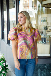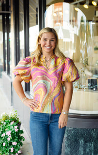 Elevate your wardrobe with The Starlight Top, featuring short puff sleeves and a ruffled neckline that add a feminine touch. Its multi-color abstract jacquard fabric offers rich texture and vibrant style, while the lightweight 100% polyester ensures comfortable wear all day. Perfect for making a statement with effortless charm.