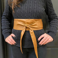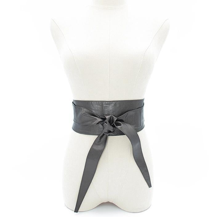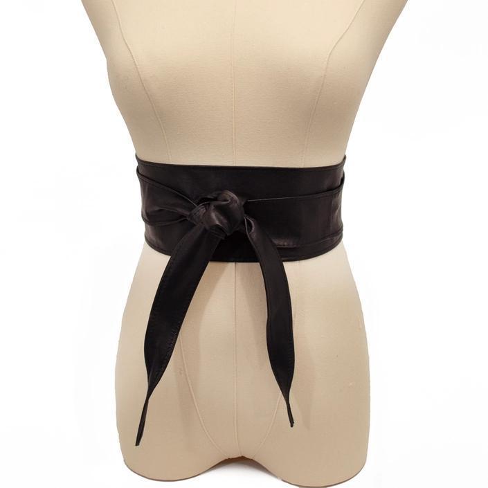 Smooth Italian leather wrapped Obi belt. 3 3/4" wide in the front and tapers. Adjustable
