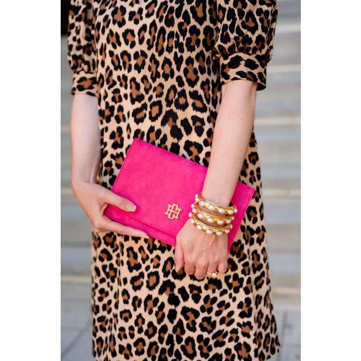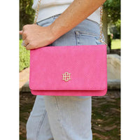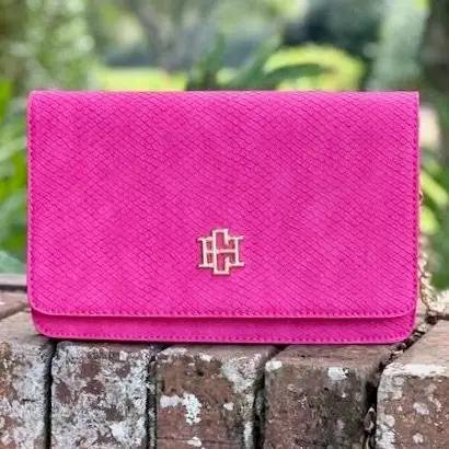 This stunning handbag is a showstopper. It features a gorgeous textured material and a structured silhouette. The front magnetic flap leads to a well organized interior with card slots, a large open back pocket, and a front zippered section. The versatile design allows it to be carried as a stylish clutch or crossbody with the removable strap. It's the perfect accessory for any occasion. Dimensions: * 6.5" tall by 10" wide * 1.5" base