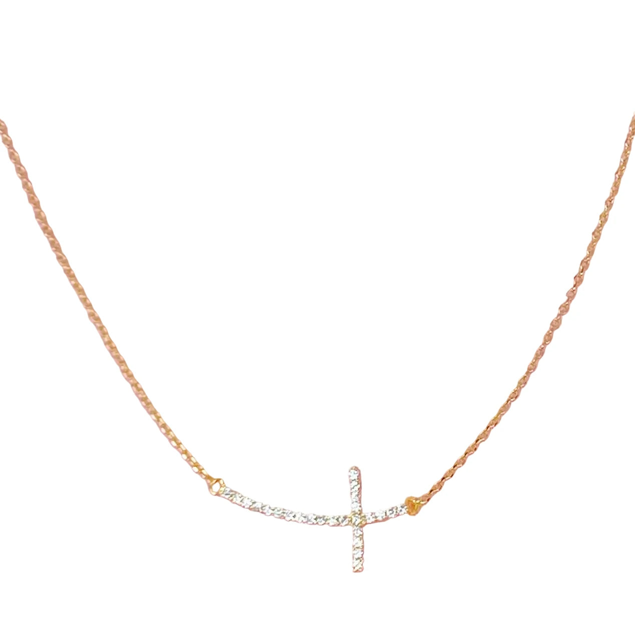 Beautiful cross necklace with little bit of twist, curved shape with shiny stones on. Perfect for everyday wear! Dimensions: 16” chain with 2” extender Gold plated Brass Lead and Nickel compliant