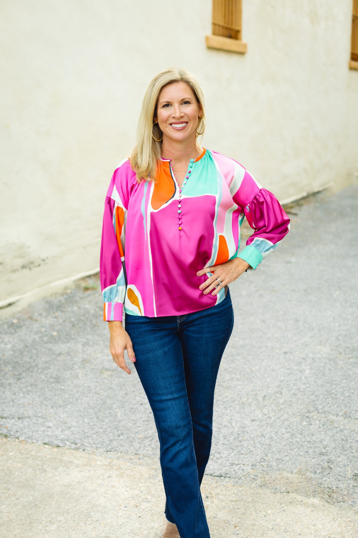 The Bryleigh Blouse is effortlessly chic with its tunic-length silhouette and relaxed fit. Designed for versatility, it features a button-front closure, a crew neckline, and full-length balloon sleeves with cuff details. Thanks to your feedback, the Bryleigh Blouse now fits even better! Go with your true size for an oversized look, or size down if you prefer a slimmer silhouette.