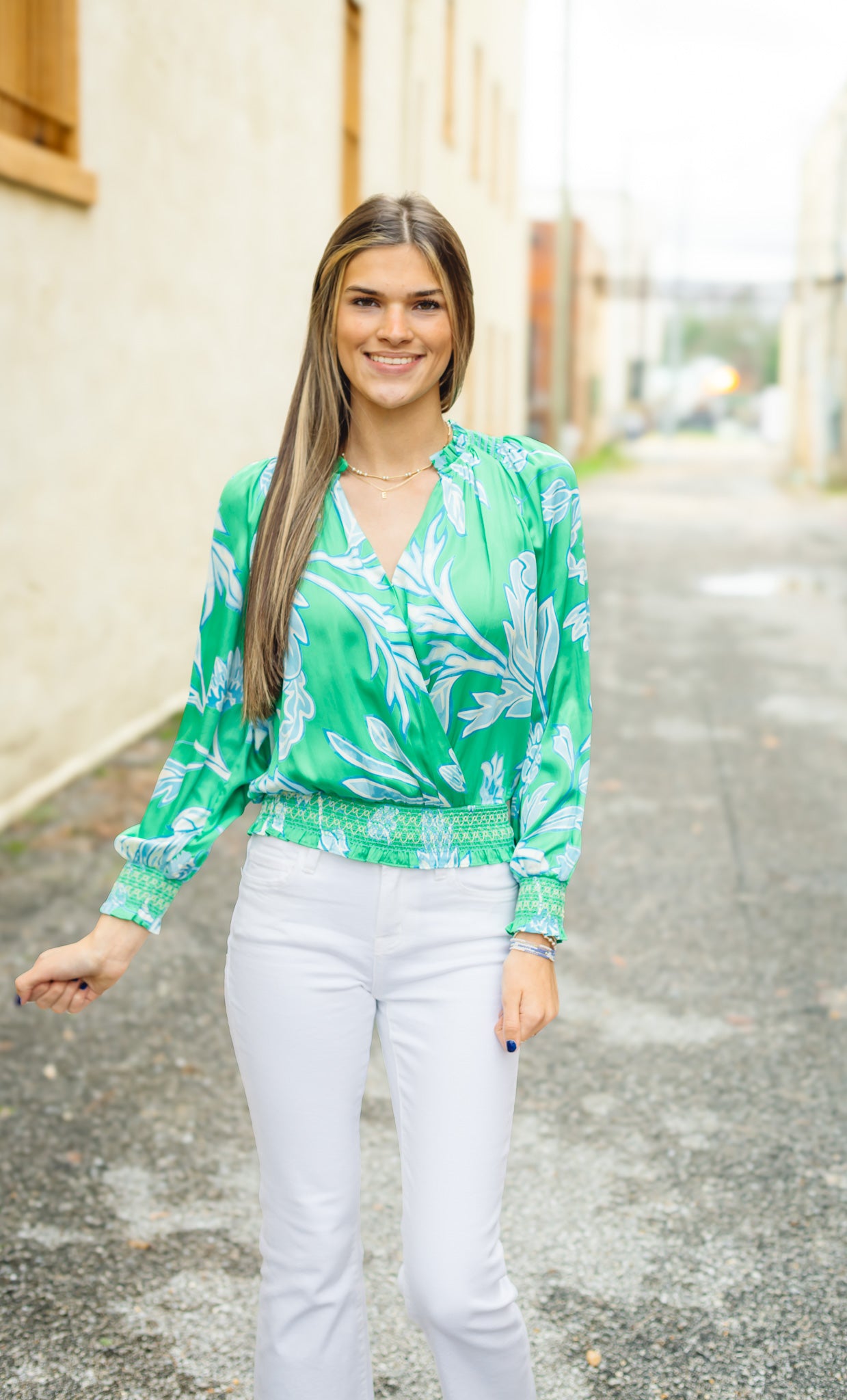Elevate your wardrobe with The Chantilly Top, a romantic floral print piece that combines timeless elegance with modern comfort. The ruffled surplice neckline creates a flattering silhouette, while hidden snap buttons ensure a polished look. Balloon sleeves with smocked cuffs add dimension and movement, complemented by delicate picot stitch detailing at the shoulders, cuffs, and hem. The smocked hem provides structure and visual interest. Perfect for dressing up or down, this versatile top brings effortless sophistication to any occasion. Care for it gently with cold water washing to maintain its beautiful details.