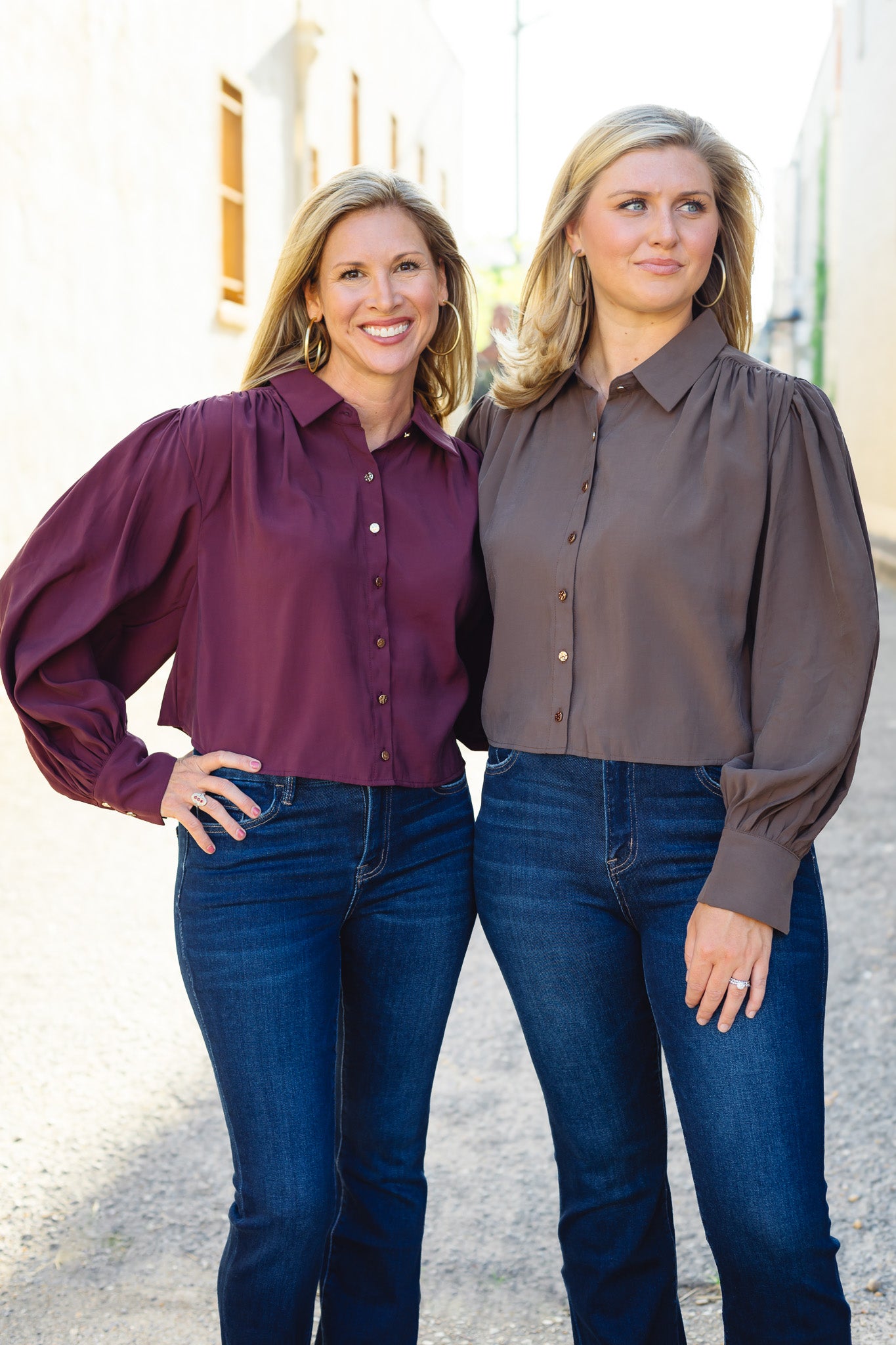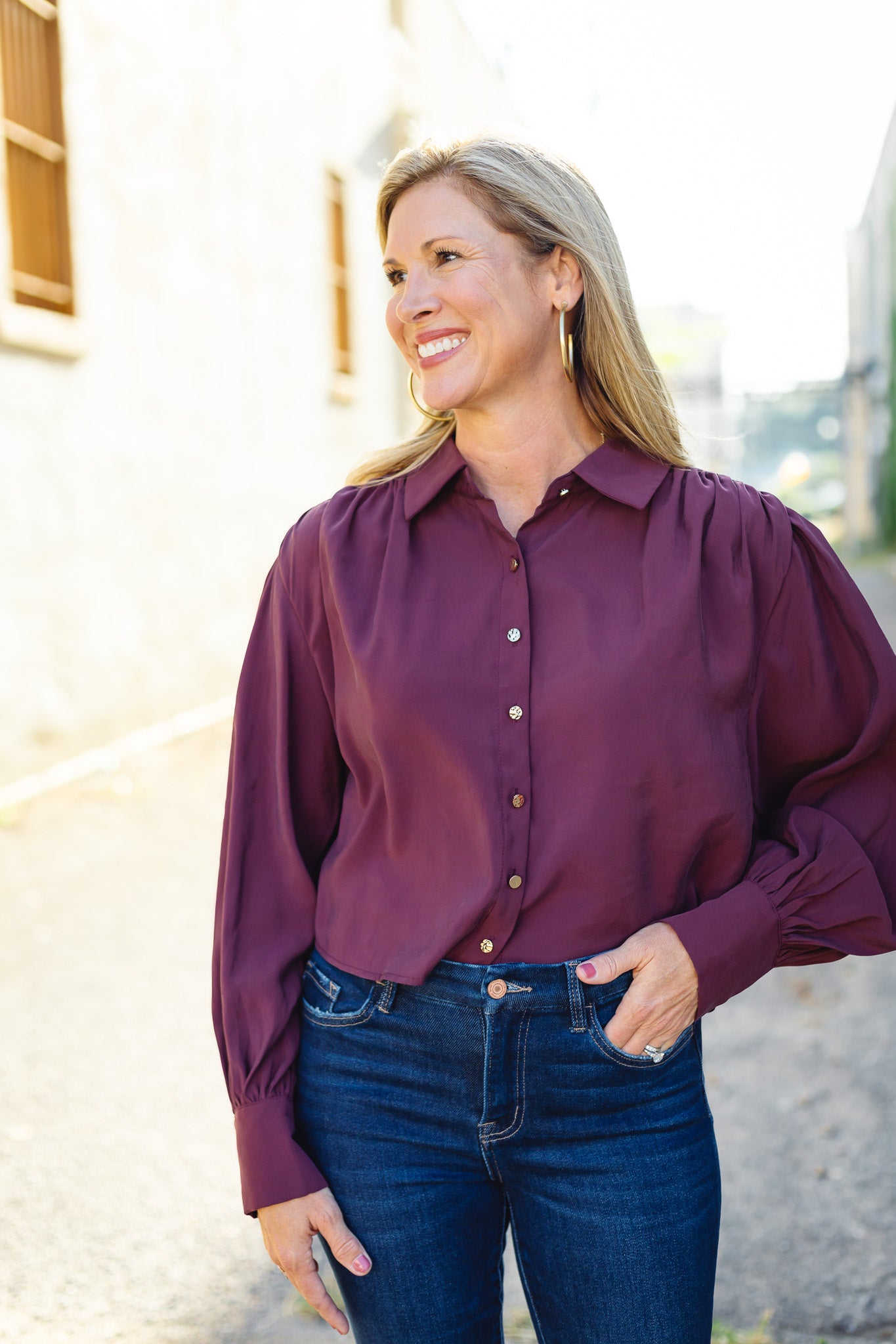 The Falling for You Top in Wine features elegant gathered detailing and a row of buttons down the front, adding a touch of sophistication to your wardrobe. Its rich wine color enhances any look, making it perfect for both casual outings and special occasions. Comfortable and flattering, this top effortlessly elevates your style.