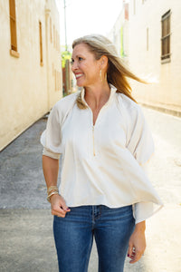 Elevate your wardrobe with The Farrah Top in Cream, featuring a chic mock neck and stylish band puff sleeves. Crafted from soft, durable polyester with a comfortable cotton blend contrast, this blouse offers both elegance and all-day comfort. Perfect for work or weekend outings, it adds a refined touch to any outfit while ensuring a flattering fit.