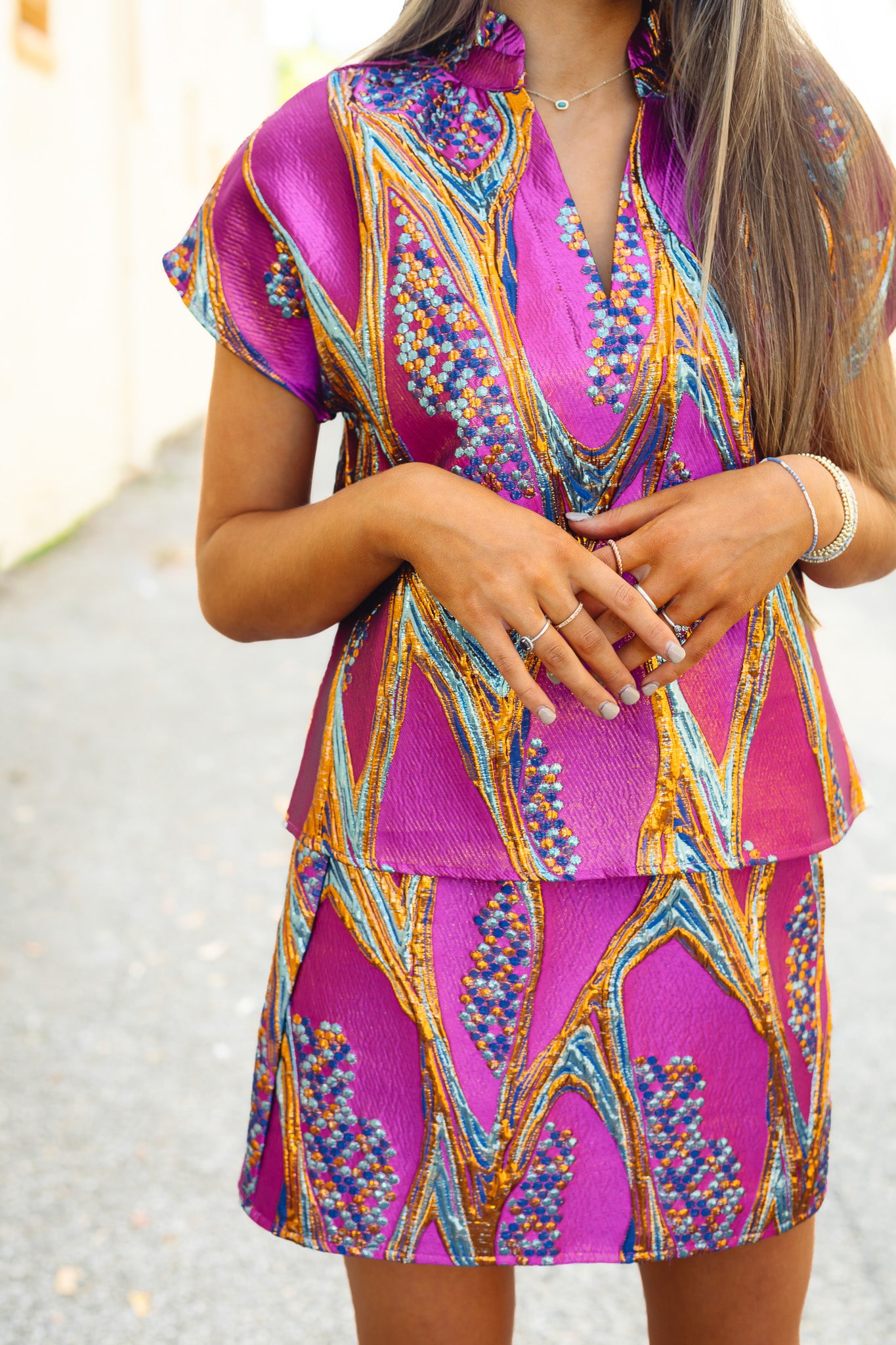 Embrace your inner enchantress with The Glinda Top, a short-sleeve essential featuring a vibrant pattern that captures pure magic. This eye-catching piece pairs effortlessly with the matching Glinda Skirt for a coordinated look that turns heads. Perfect for anyone seeking bold style with undeniable charm, this top brings personality and pizzazz to your wardrobe. Make a statement that's as unforgettable as you are.