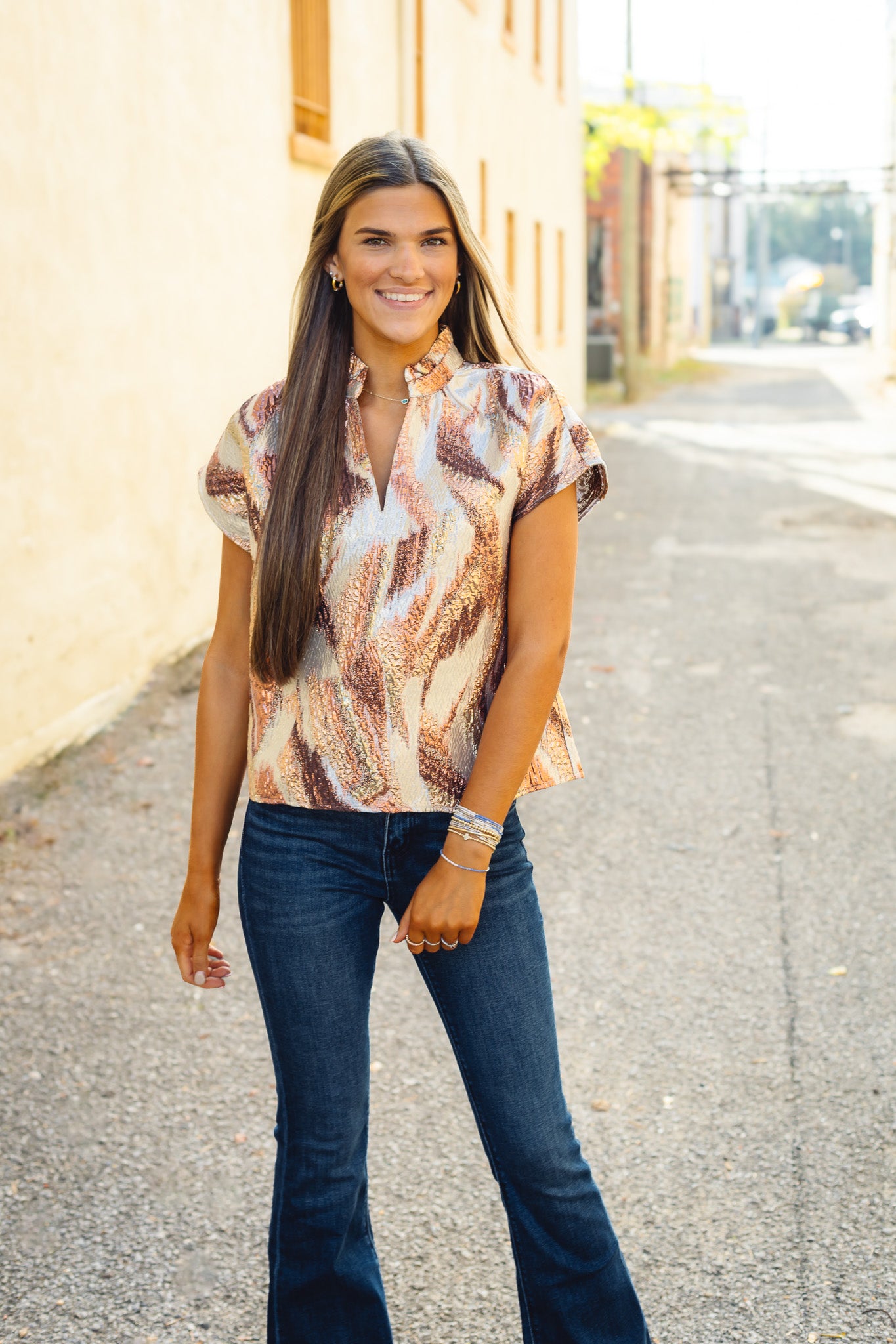 Elevate your everyday wardrobe with The Iris Top, a stunning short sleeve piece that blends sophistication with playful flair. Featuring shimmering metallic accents woven throughout the cream base, this versatile top catches the light beautifully and transitions seamlessly from day to night. The soft, breathable fabric keeps you comfortable while the multicolored metallic details add just the right amount of glamour to any outfit. Perfect for dressing up casual looks or adding sparkle to your essentials.