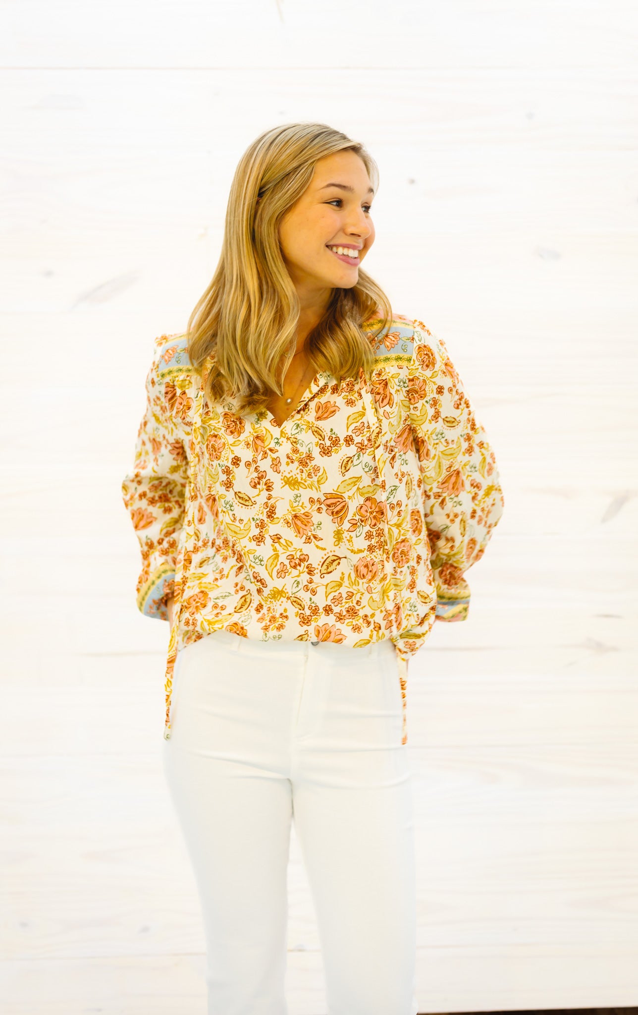 The Luckett Top brings effortless elegance to your everyday wardrobe. This peasant blouse features a charming border print and romantic tie neck detail that flatters any frame. Crafted from a luxurious rayon and nylon blend, the fabric drapes beautifully while maintaining its shape, offering both comfort and sophistication. Perfect for dressing up casual outfits or layering under your favorite jacket, this versatile piece transitions seamlessly from day to night. Elevate your style with timeless appeal.