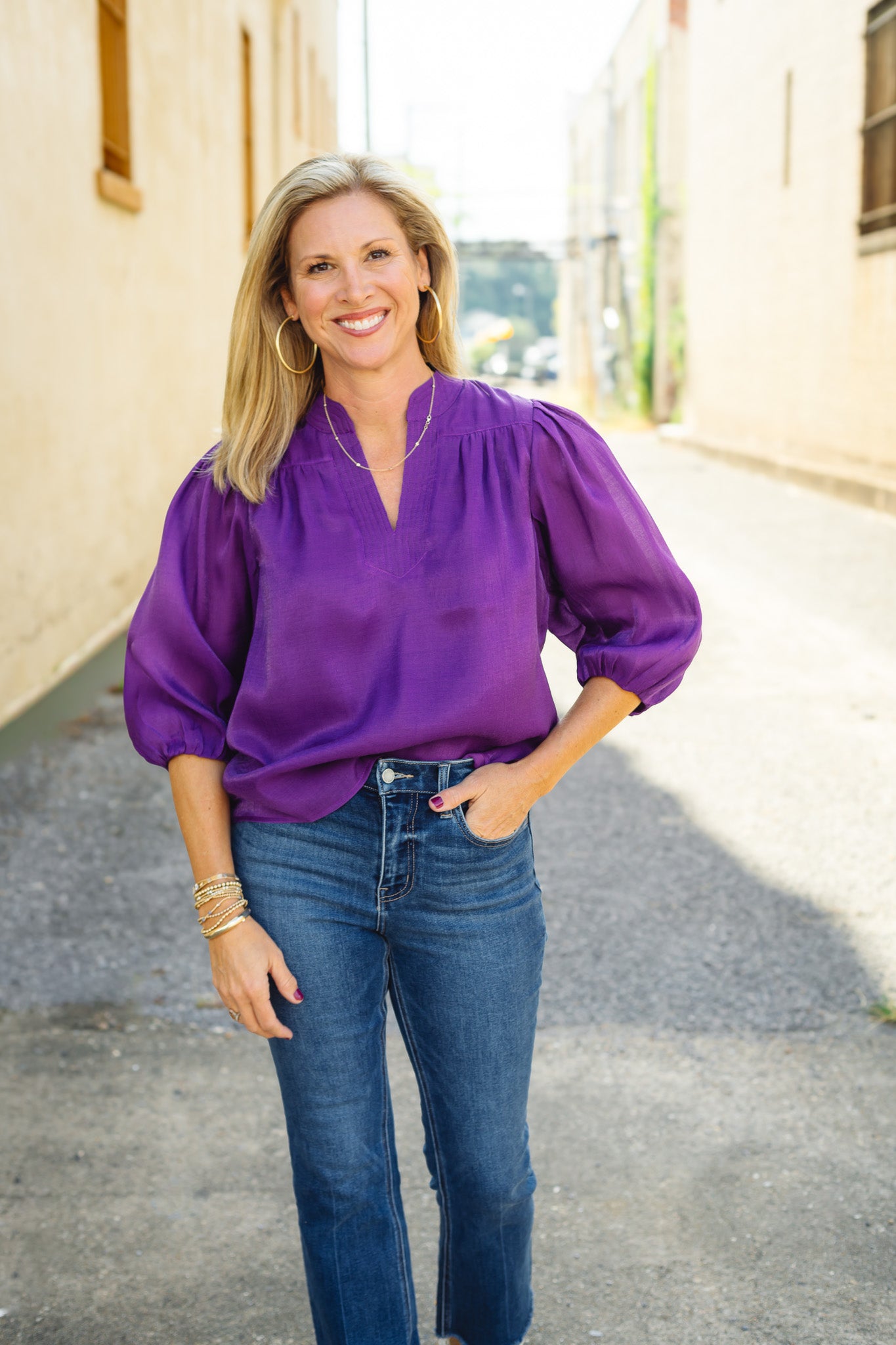 Elevate your wardrobe with The Perina Top, featuring a stylish stand collar and a chic split neck design. Its three-quarter puff sleeves add a touch of elegance, while the rich plum color makes a bold, sophisticated statement. Perfect for both casual outings and special occasions, this top combines classic details with modern flair to effortlessly enhance your look.