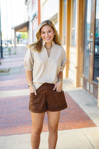 The Tracy Top offers a chic blend of comfort and style with its solid short puff sleeves and flattering split V-neck paired with a stand collar. Crafted from a lightweight woven fabric that combines 50% cotton and 50% polyurethane faux leather, this unlined top ensures a soft feel without compromising on structure. Elasticated sleeve openings add a subtle touch of volume while maintaining a perfect fit. Its non-sheer design makes it an ideal choice for effortless daytime or evening wear. Elevate your wardrobe with this versatile, contemporary statement piece.