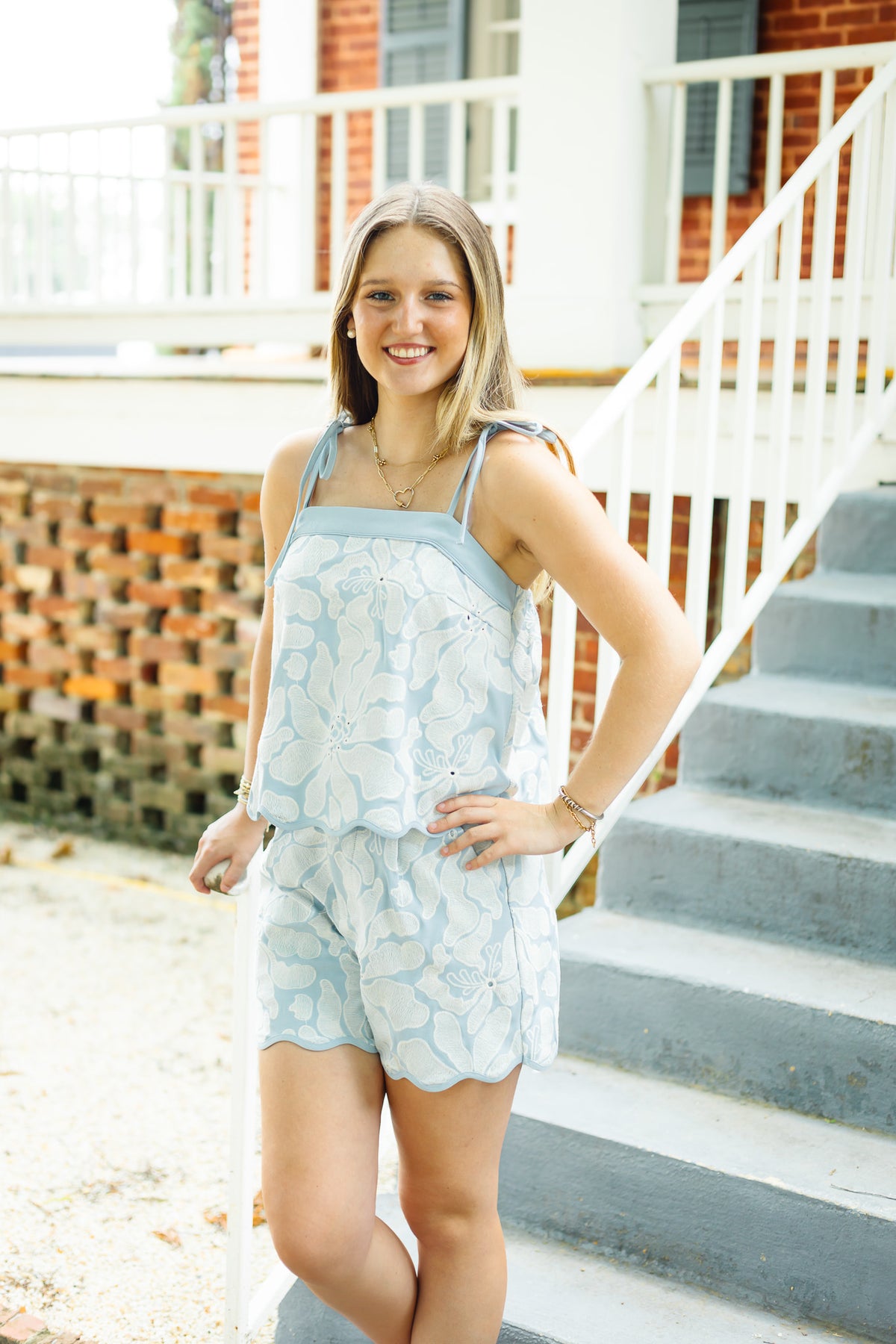 Floral embroidered straight neck shoulder tie pullover top featuring scallop binded hem finish. Lined. Woven. Non-sheer. Lightweight. 100% cotton