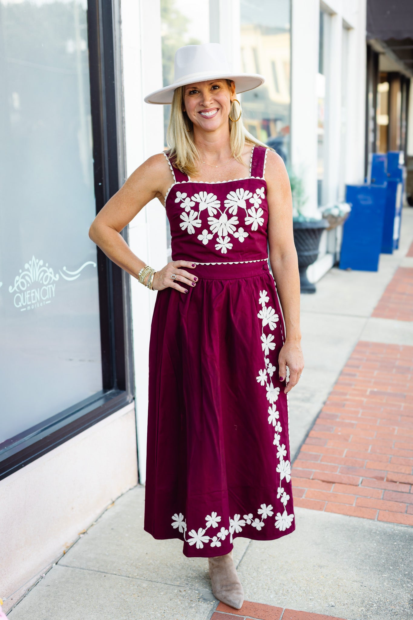 Elevate your style with The Luna Set, featuring an embroidered crop top and matching midi skirt in a rich burgundy hue. Crafted from 100% cotton, this sleeveless ensemble offers breathable comfort while highlighting your silhouette beautifully. Perfect for both casual outings and special occasions, The Luna Set combines elegant detailing with effortless wearability.