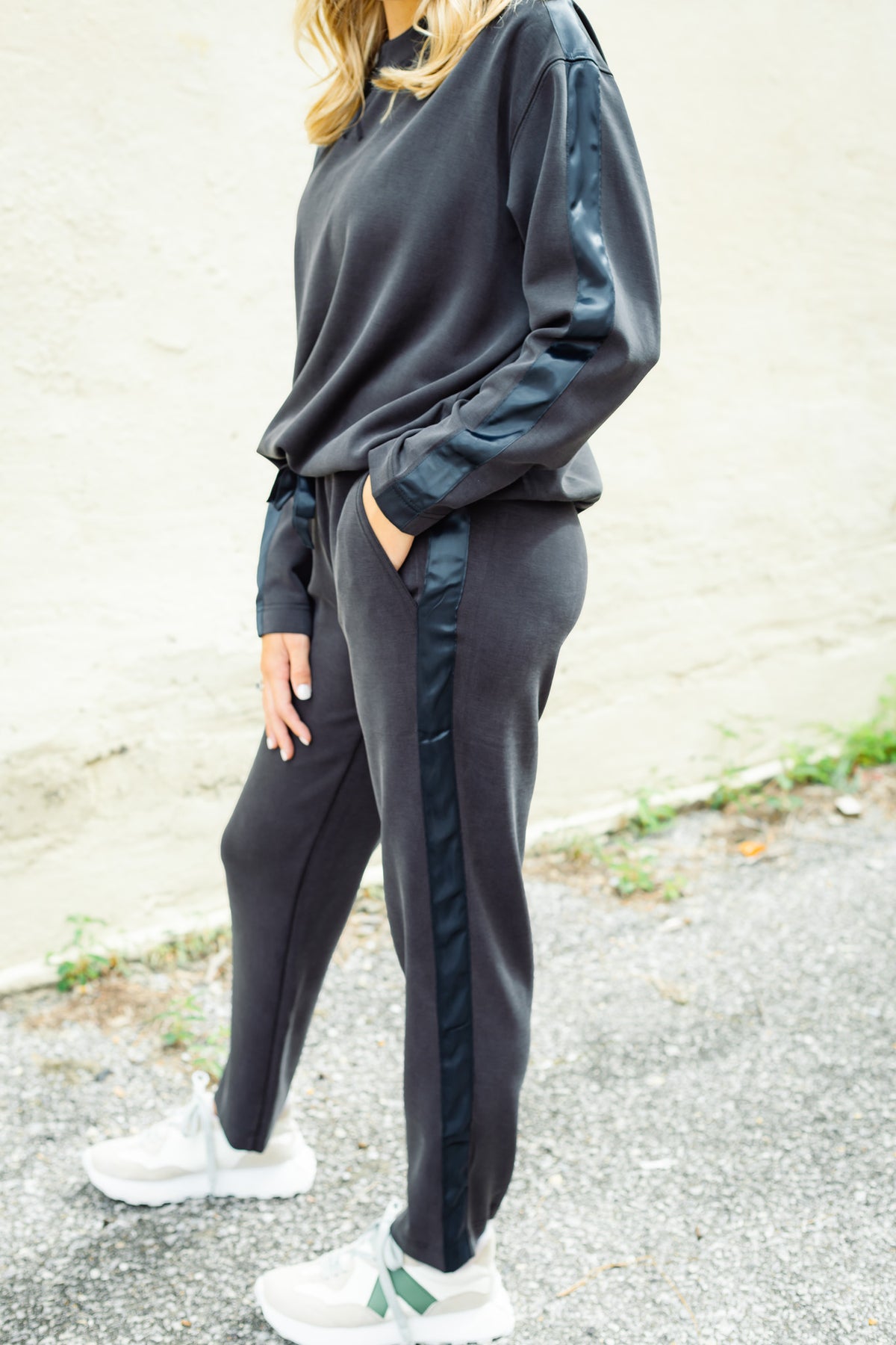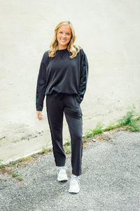 The Making a Move Set features lounge pants and a crew neck sweatshirt, both crafted in a sleek black blend of 48% viscose, 48% polyester, and 4% spandex. Each piece is enhanced with subtle contrast satin trim detailing, elevating comfortwear to a stylish statement. Designed for effortless movement and all-day wear, this set combines soft stretch fabric with refined accents for a look that’s both cozy and polished. Perfect for lounging or casual outings, it brings versatility and sophistication together in one seamless package.