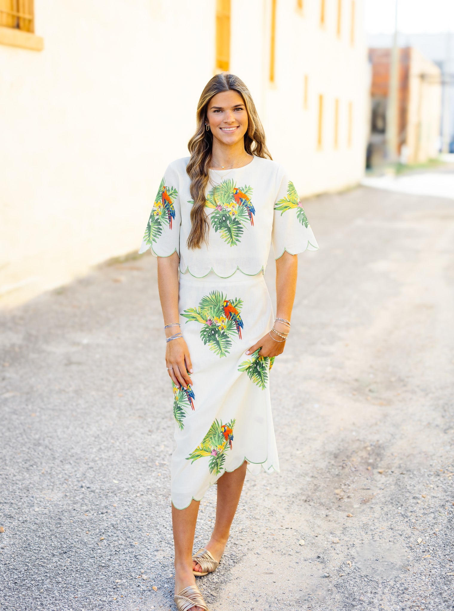 Elevate your wardrobe with this stunning printed woven midi skirt, designed for effortless sophistication. The graceful scallop edge adds a delicate feminine touch, while the convenient side zipper closure ensures a perfect fit every time. Crafted from a breathable blend of cotton, rayon, polyester, and linen, this skirt offers comfort and durability for all-day wear. The polyester lining provides smooth movement and lasting shape. Whether you're dressing up for an occasion or keeping it casual, this versatile piece transitions seamlessly from day to night.