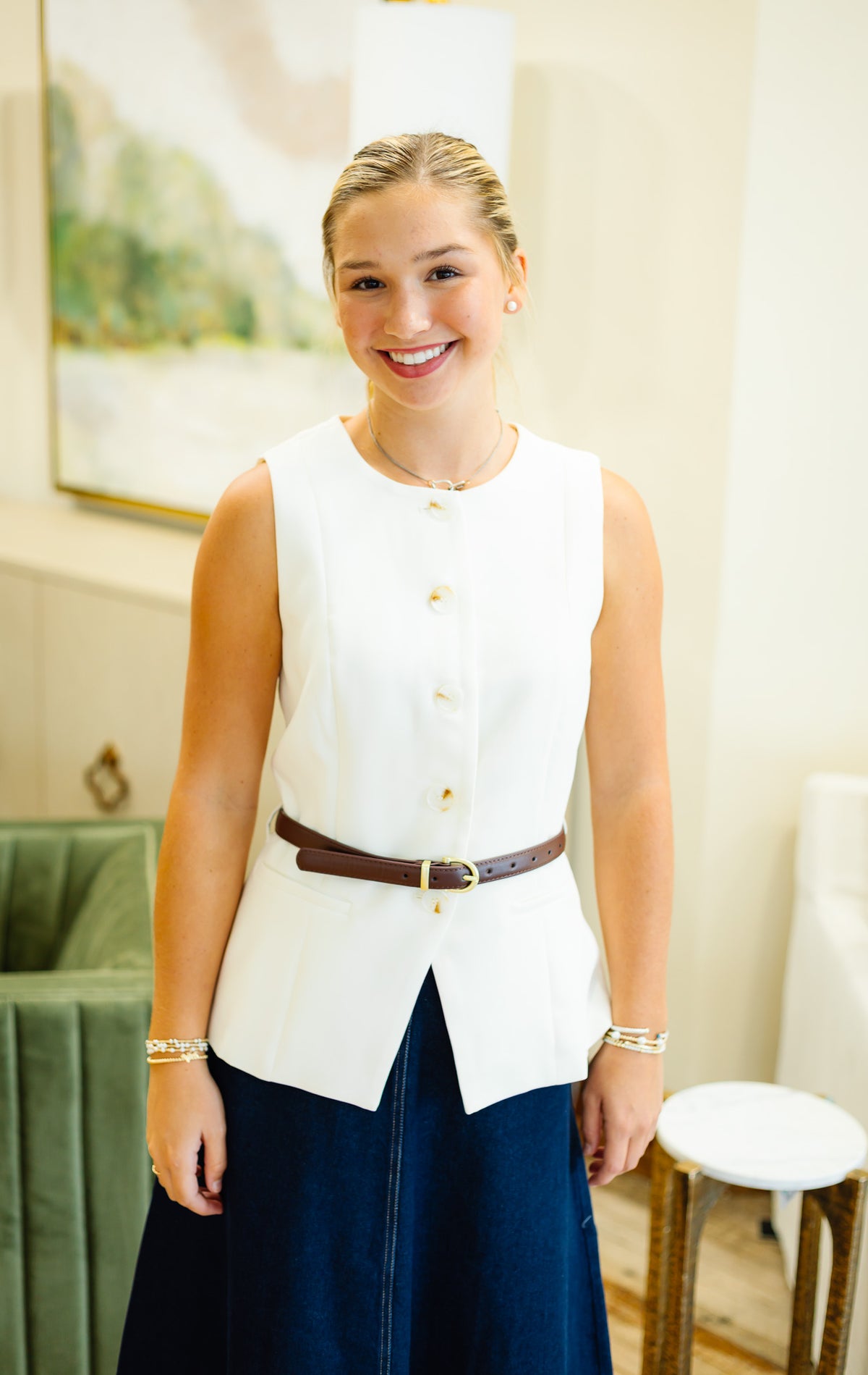 Elevate your wardrobe with The Anna Vest in a versatile ivory shade, perfectly paired with a stylish brown belt. This combination adds a refined touch to any outfit, offering both comfort and elegance. Ideal for layering, The Anna Vest seamlessly blends classic tones to enhance your everyday style.