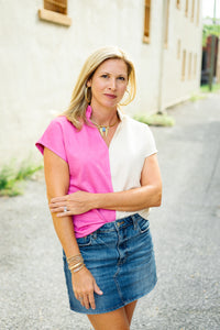 Elevate your wardrobe with The Elowen Top, featuring a chic color block design in soft cream and playful pink suede. This top effortlessly blends texture and color, making it a versatile statement piece that can brighten any outfit. Perfect for adding a touch of sophistication and modern style to your everyday look.