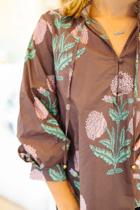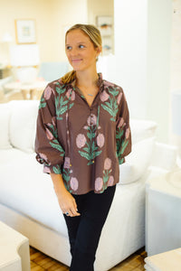 Floral print ¾ cuff bubble sleeve pullover top. Front self button closure with adjustable tie at ruffle finish neckline. Unlined. Woven. Non-sheer. Lightweight.