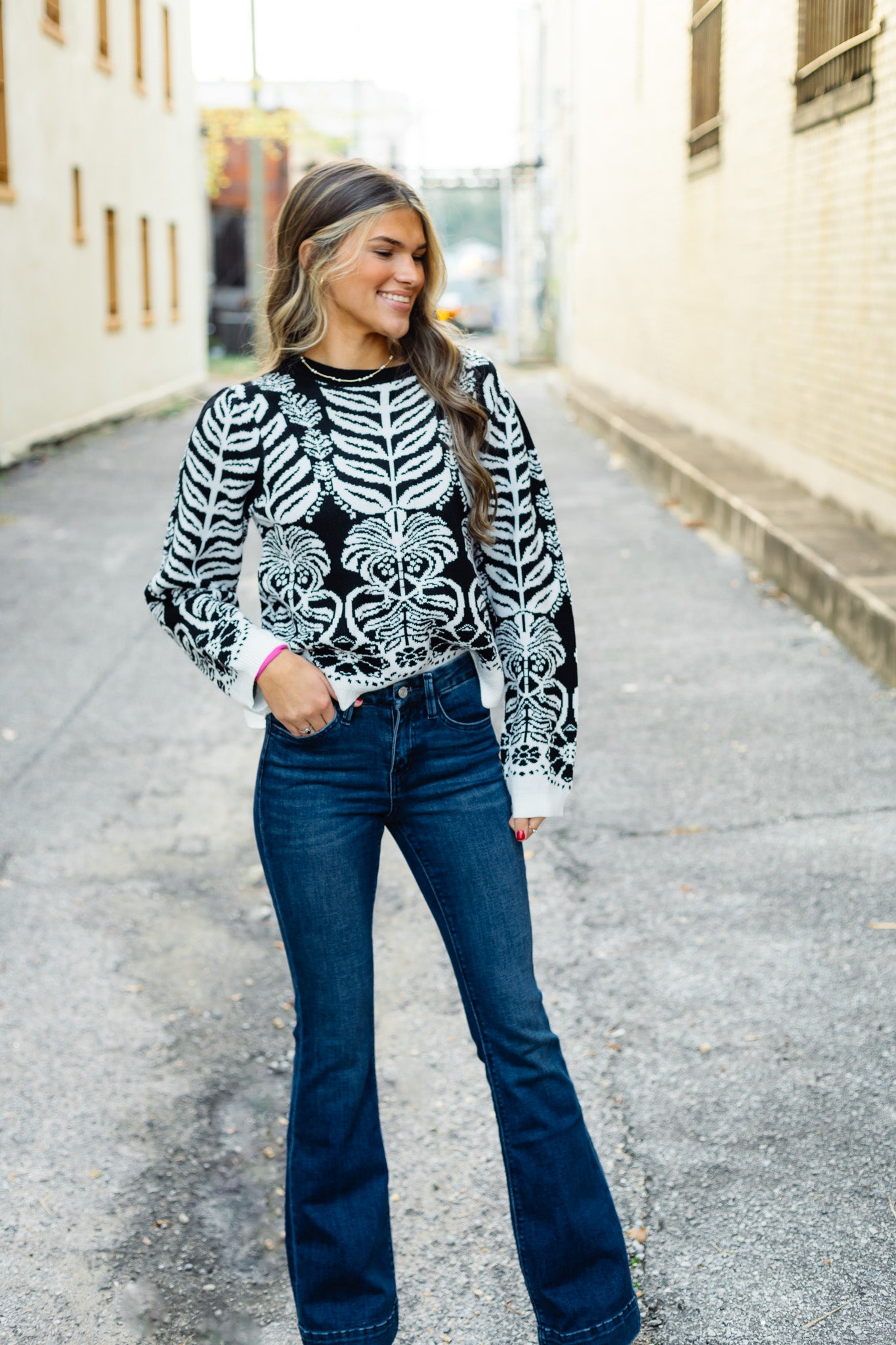 The Tesla Sweater brings effortless sophistication to your everyday wardrobe. This striking black and white printed design features a charming scalloped hem that adds a refined touch to a classic silhouette. The eye-catching pattern makes it versatile enough to pair with solid basics or layered under jackets for dimension. Perfect for transitional seasons, this sweater delivers both style and comfort, making it an essential piece that works as hard as you do.
