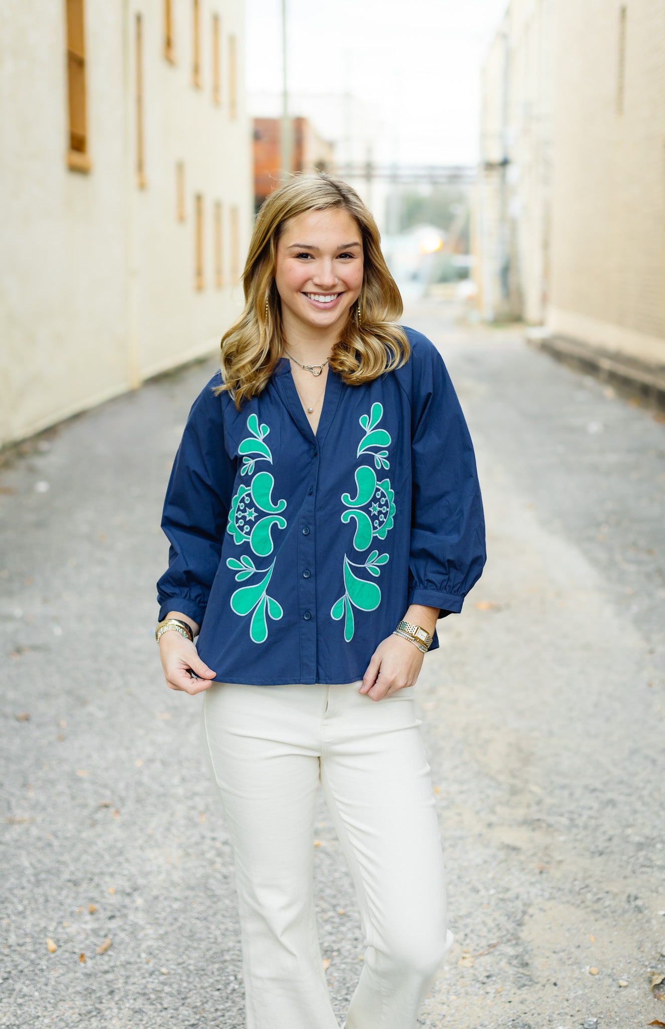 The Amery Top brings timeless elegance to your everyday wardrobe with its refined embroidery detailing. Crafted from crisp poplin fabric, this versatile piece features a sophisticated color palette of navy and emerald that transitions seamlessly from office to weekend. The intricate embroidery adds a touch of artisanal charm while maintaining a polished, put-together aesthetic. Perfect for layering or wearing solo, this top elevates any outfit with understated luxury and effortless style.