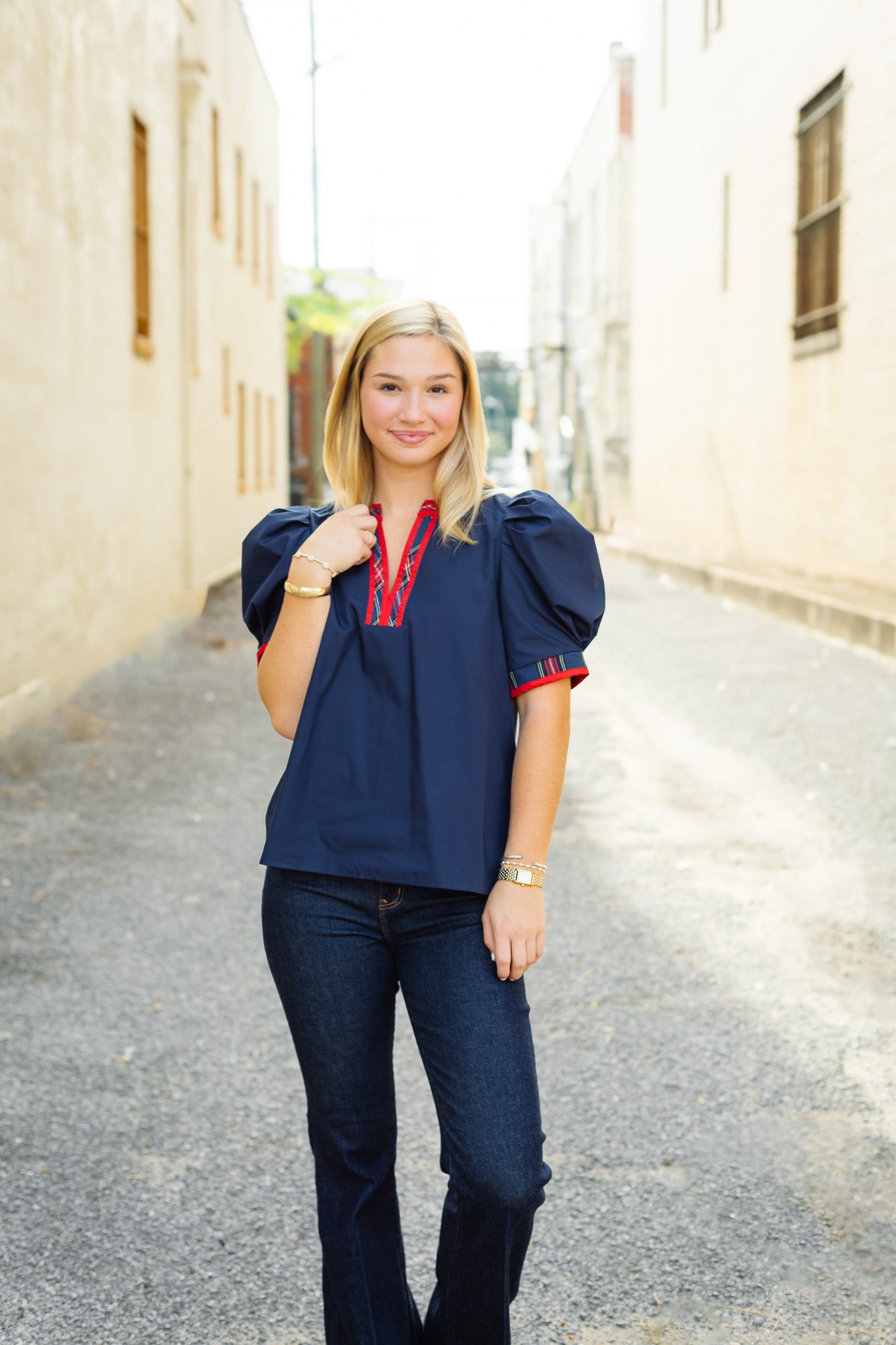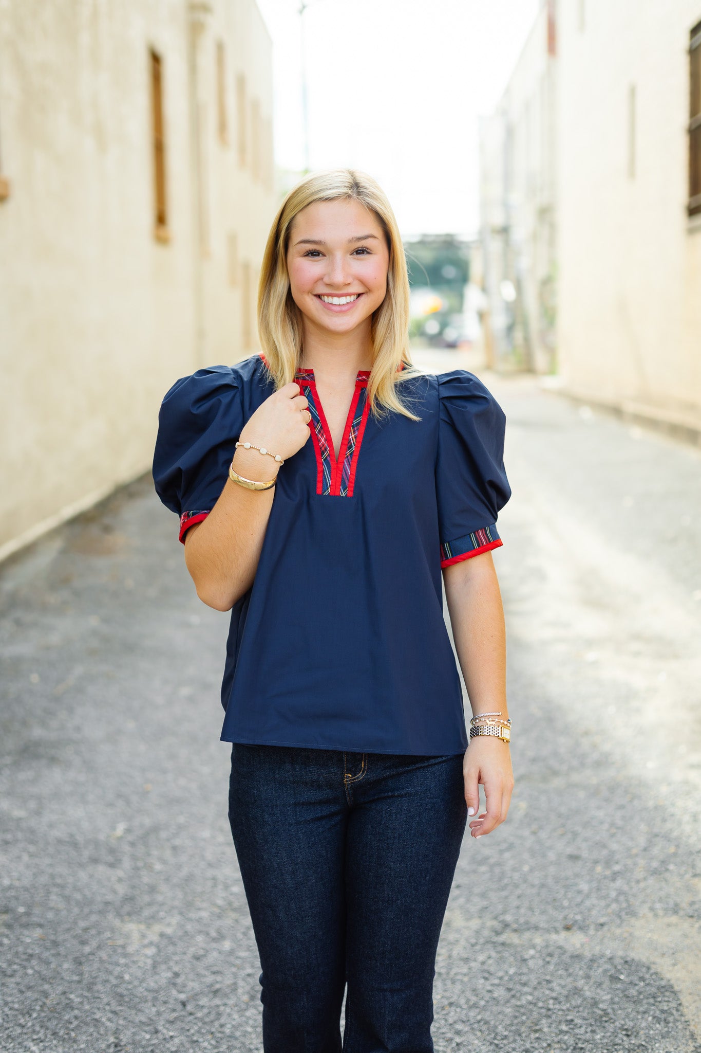 Solid short pleated puff sleeve top featuring contrast accent V-neck band. Unlined. Woven. Non-sheer. Lightweight. plaid  detail in navy
