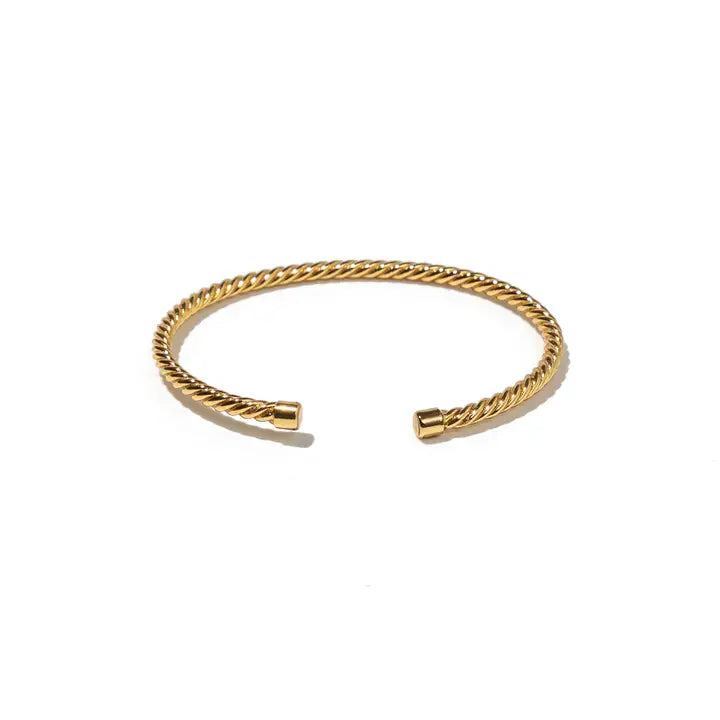 PRODUCT DETAILS Demi-Fine💧 Brass 24K Gold Handmade Hypoallergenic Nickel Free Size: 2.25" diameter; 3mm thickness. Adjustable, Fits most. DESIGNER NOTE Our signature Aspen Collection has added the Aspen Bracelet Mini to the wanderlust Masterpiece assortments. Delicately layer up your dainty wrist right along our intricate twisted outlined bracelet.