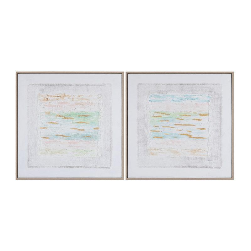 Ideal for those who appreciate the finer details in art, the "Belmar" wall art is a striking celebration of texture and color. This 41.6x41.6" pair depicts a hand-embellished design in a soothing palette of white, cream, blue, and gold paint on a beautifully textured frayed-edge linen canvas. Each artwork is framed with natural wood, a choice that enhances the design's delicate charm and organic aesthetic. Versatility is key with this set, as you can hang these pieces together to create a gallery display or separate them to bring a touch of artistry to multiple spaces. The included D-ring brackets offer seamless installation, allowing any wall to be transformed into a stylishly, contemporary sanctuary.