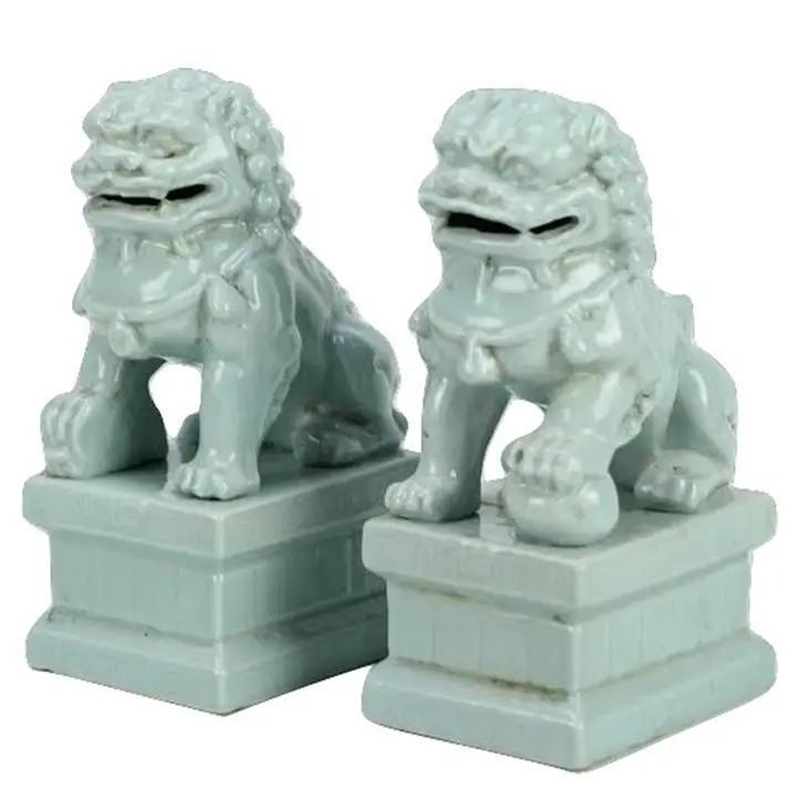FABULOUS PAIR OF MINI PALE BLUE FOO DOGS. JUST A DARLING ADDITION TO ANY EXISTING VIGNETTE OR TO USE AS BOOKENDS. DETAILS MEASURES 4" X 6"