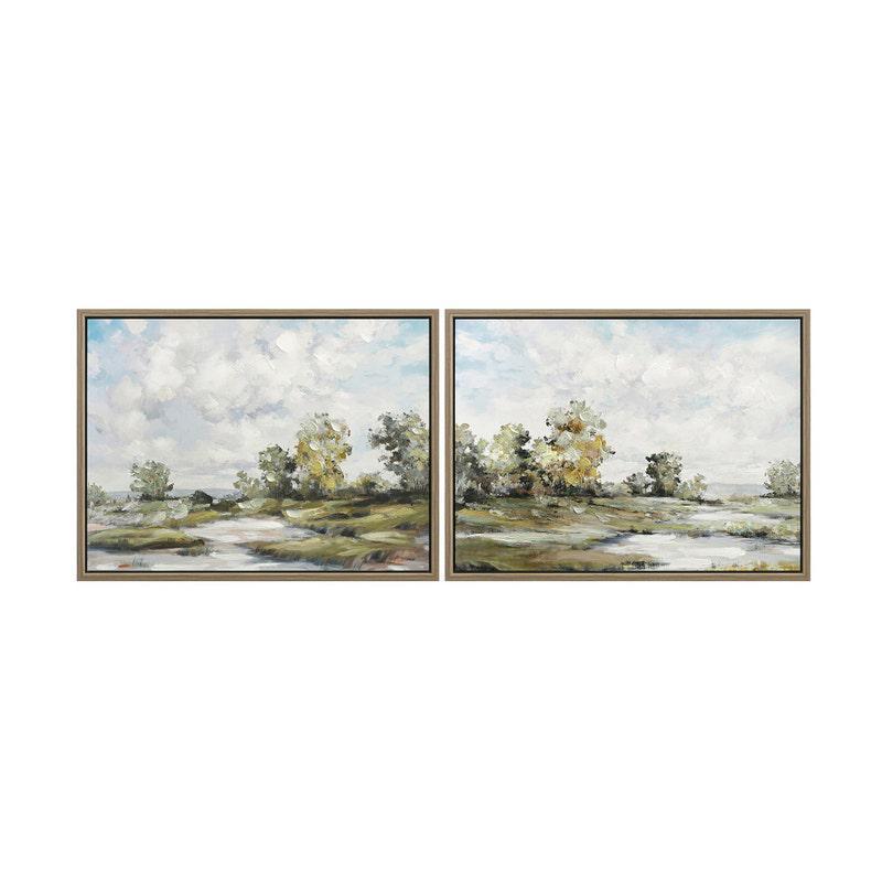 Thoughtfully designed, the "Moore" paintings are an ideal choice for those looking to bring the outdoors inside. This captivating 31.5x23.6" pair features a hillside landscape filled with vibrant green trees that sway gently atop a grassy knoll. The artwork beautifully depicts a freshwater creek that meanders through the landscape against a backdrop of blue sky and billowing clouds. The careful attention to detail in the foliage and the play of light across the water adds depth and richness to each canvas, immersing viewers in the beauty of nature. Each painting is beautifully encased in a natural brown wood frame that emphasizes the organic elements of the scene. Carefully mount the set to any desired wall space with the included D-ring brackets for the ultimate cottage-inspired aesthetic. *Sold Separately