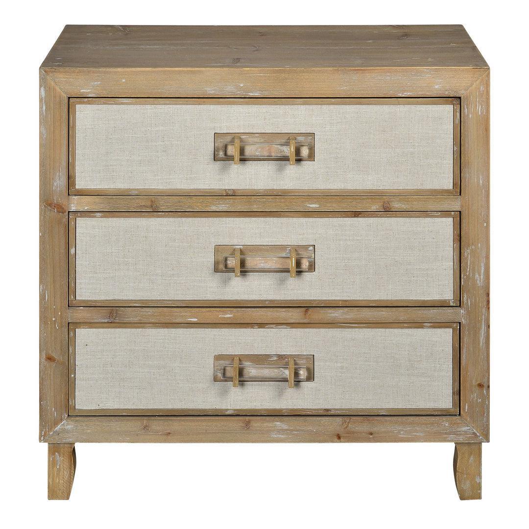 Murphy Chest - Blending rustic charm with refined elegance, this three-drawer chest features a distressed wood frame that highlights the natural grain and texture. The drawer fronts are wrapped in a soft linen-like fabric, adding a sophisticated contrast, while acrylic and brass hardware provide a modern touch. Its sturdy construction and spacious drawers offer practical storage, making it a versatile addition to bedrooms, living spaces, or entryways. With its mix of textures and finishes, this chest brings warmth and character to any space.