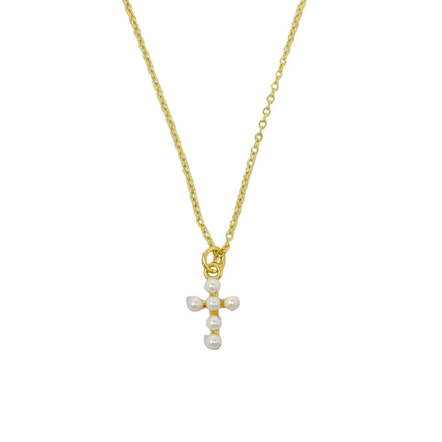 This pearl inspired cross necklace is perfect for everyday wear! Has great dainty details and absolutely precious! Dimension: Necklace is 16" in length with a 2" extender. Cross is 0.62" (L) x 0.39" (W). Stainless Steel Chain, tarnish free