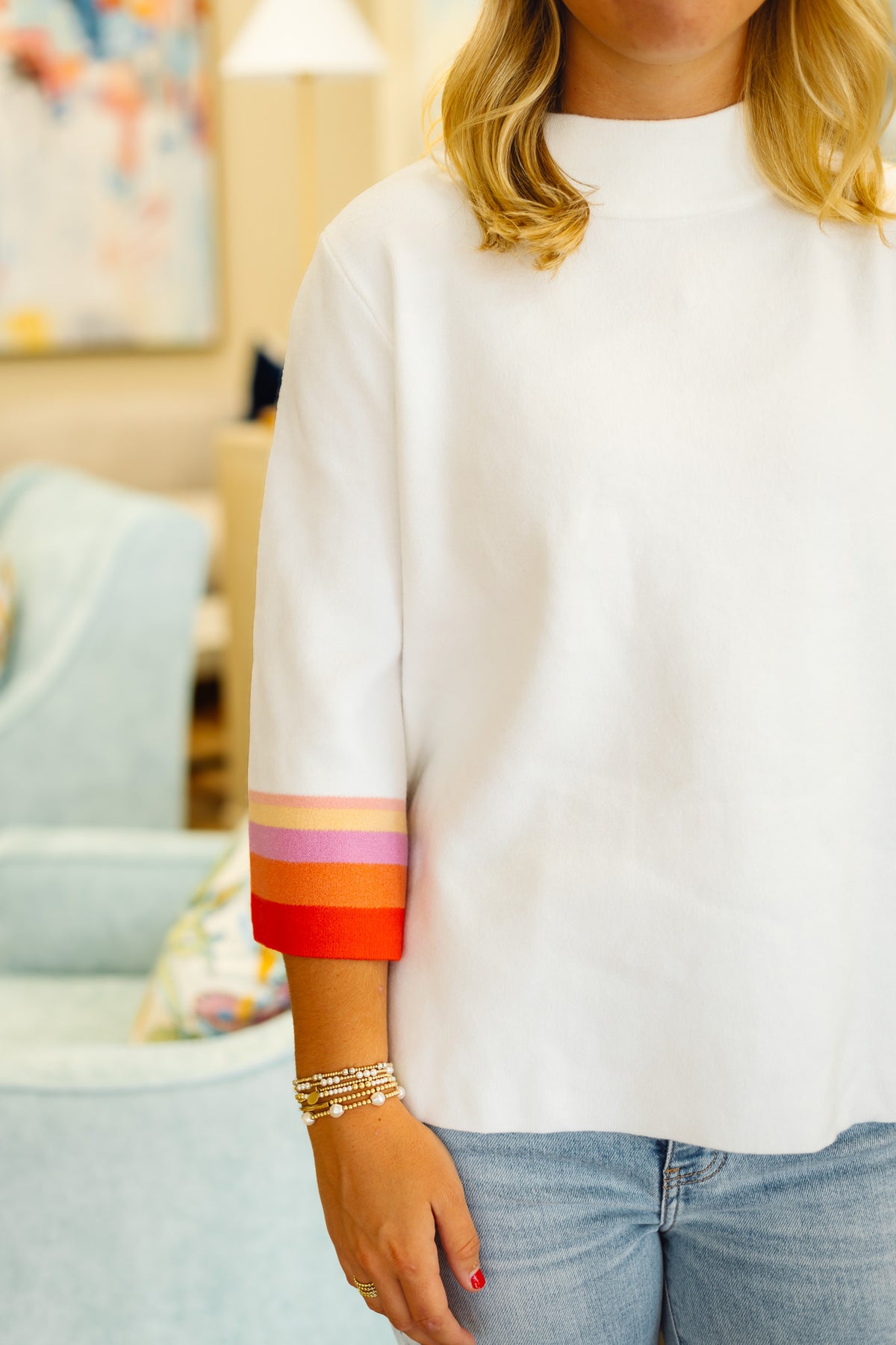 Stay stylish and comfortable with The Jetta Sweater, featuring a chic mock neck and vibrant multi-color striped sleeves. Crafted from a soft blend of 55% viscose and 45% nylon, this cream-toned pullover offers warmth and breathability for everyday wear. Perfect for layering or wearing on its own, it adds a fresh pop of color to your wardrobe while keeping you cozy.