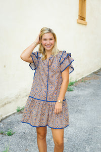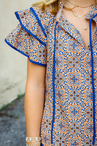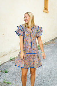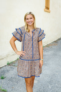 The Nanette Dress in Mediterranean Tile features a vibrant orange and navy print that captures effortless elegance. Its flutter sleeves and tie neck add a delicate, feminine touch, while the tiered design creates graceful movement. Perfect for warm days or special occasions, this dress combines comfort with standout style to elevate your wardrobe.