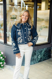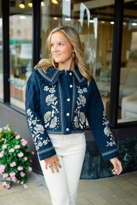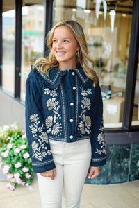 Elevate your outerwear with The Petuna Jacket in Navy. Featuring a charming Peter Pan collar and delicate embroidered quilting, this jacket combines classic style with cozy comfort. Crafted from a soft blend of 60% rayon and 40% polyester, it offers lightweight warmth and smooth texture, perfect for layering on cool days. Make a subtle yet stylish statement wherever you go with this timeless piece.