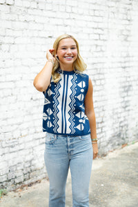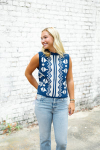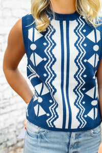 Elevate your wardrobe with the Quinby Sweater in Navy, a stylish knitted sleeveless sweater by THML. Its unique printed design adds a modern touch, while the sleeveless cut offers versatile layering options. Perfect for transitioning between seasons, this sweater combines comfort and fashion effortlessly, making it a must-have piece for any chic closet.