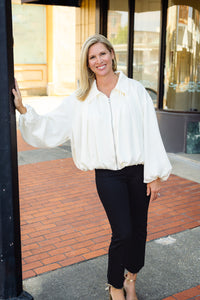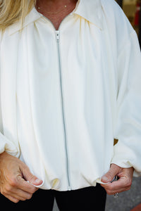 Elevate your look with The Tova Jacket, a cream satin bomber featuring elegant puffed sleeves and a classic collar. This jacket blends stylish sophistication with a modern edge, making it perfect for both casual outings and dressier occasions. Soft satin fabric offers a luxurious feel, while the unique silhouette adds a standout touch to your wardrobe. Make a statement effortlessly with The Tova Jacket.